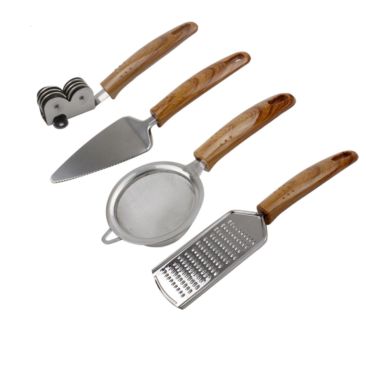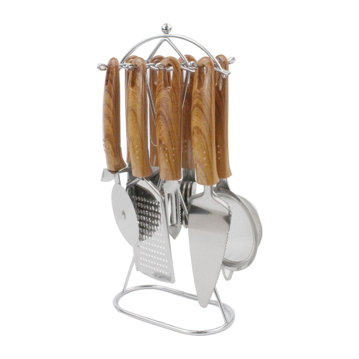 Комплект кухненски прибори ЕК-6672 от 8 части, изработени от висококачествена неръждаема стомана. Включва отварачка за консерви, нож за пица, ситно ренде, лопатка за нарязване, нож за белене, цедка за чай, прибор за наточване на ножове и стойка/органайзер с височина 32 см.