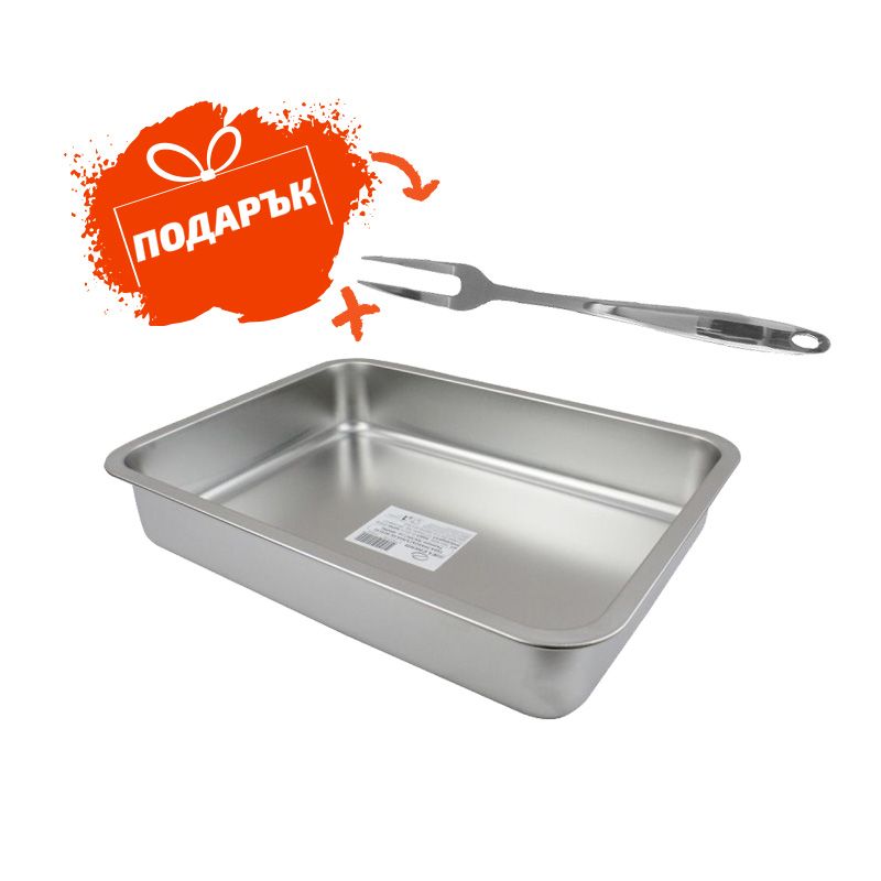 ТАВА EK-4833 SS + EK-F4 ПОДАРЪК Тава Правоъгълна-Инокс EK-4833 SS Размери: 41x29x6 Вилица за месо • Висококачествена неръждаема стомана • Дебелина: 2 мм