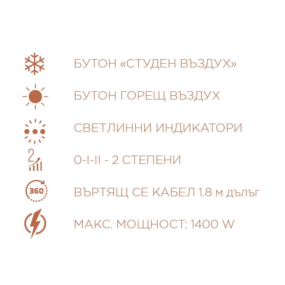 Сешоарът предлага две степени на работа, бутон за студен въздух и бутон за горещ въздух.Генерира отрицателни йони за неутрализиране на статичното електричество, намаляване на наелектризирането и запазване на гладък и блестящ вид на косата. Светлинните индикатори улесняват управлението, а тихият режим гарантира комфорт при всяка употреба.