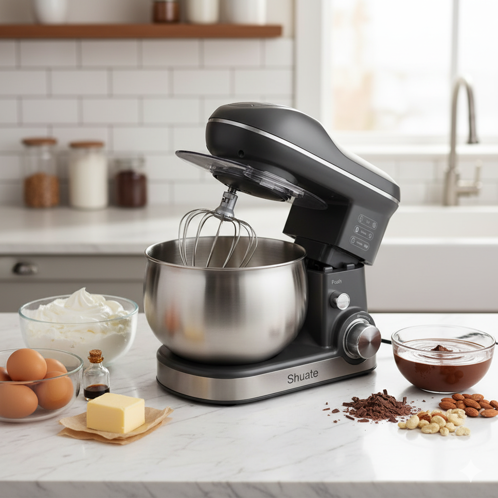 Планетарен миксер SU-216S помощник за всяка кухня! С купа от неръждаема стомана с капацитет 5 литра и защитен капак против пръскане, този миксер е перфектен за смесване, разбиване на яйца и месене на тесто. Снабден с бъркалки за различни нужди и кука за тесто, той предлага лесно почистване и стабилност благодарение на неплъзгащите се крачета. Разглобяемите части улесняват поддръжката, а 6-те режима на работа и функцията Турбо осигуряват максимална гъвкавост. С мощност от 1000 W, Планетарен миксер SU-216S е вашият надежден партньор в кухнята.