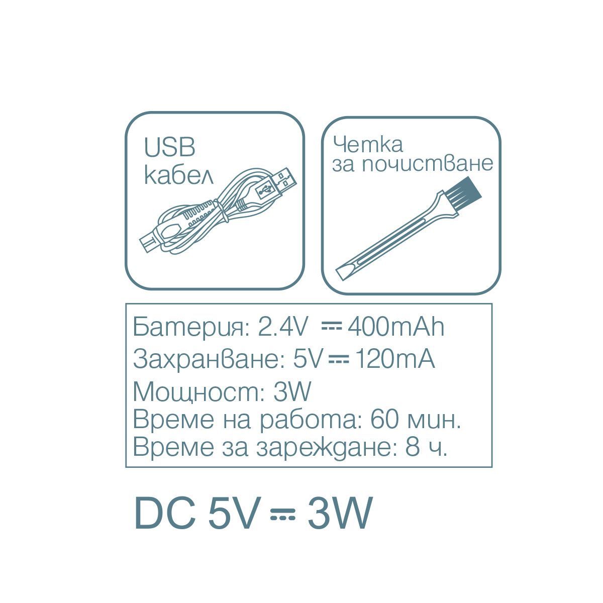 Основни характеристики:EK-V8 • Ненагряващ се връх • Светлинен индикатор • Керамично покритие / Ø13 мм • Дължина на нагреваемото тяло 178 мм • PTC Нагревател • Макс. температура 230C • Терморегулатор - 120-230C • АС: 220-240V/50-60 Hz • Макс. мощност: 45 W • Дълъг салонен кабел -въртящ се на 360 о Основни характеристики EK-2807 Мощна и прецизна разбота Време за зареждане 8 ч. USB кабел за зареждане Време на работа - 60 мин. Презаредима Светлинен индикатор Мощна батерия Стоманени мощни и прецизни остриета във всяка посока Презаредима Ni-Cd батерия Интелигентна система за бръснене Употреба със и без кабел Батерия: 2.4V- 400mAh/ Захранване: 5V-120mA Мощност: 3W/ работа 60 мин., зареждане 8 ч. Плаваща режеща главаБърза поръчка без регистрация